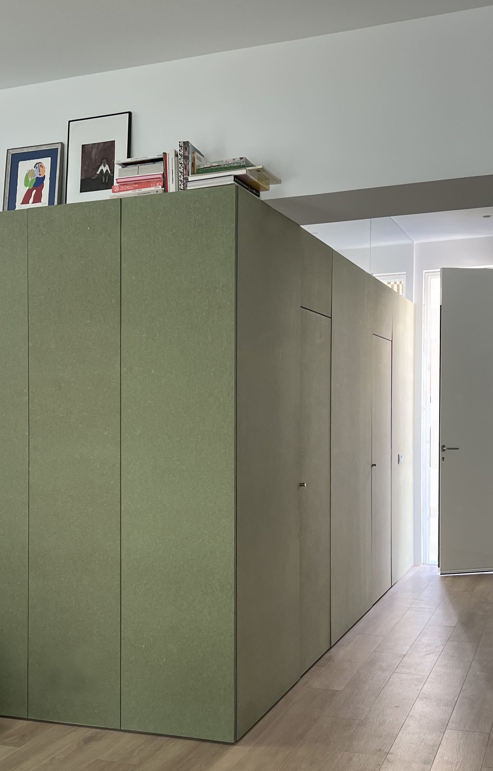 Una vivienda entre medianeras estructurada por tres pórticos que dan lugar a tres crujías de igual dimensión. Bajo las dos vigas principales se insertan tres volúmenes: por un lado, el vestidor y los módulos altos de cocina; por otro, el dormitorio y el baño, revestidos en DM hidrófugo de color verde. El desalineado entre los límites de las vigas y la posición de estos volúmenes refuerza su autonomía y la sensación de deslizamiento.