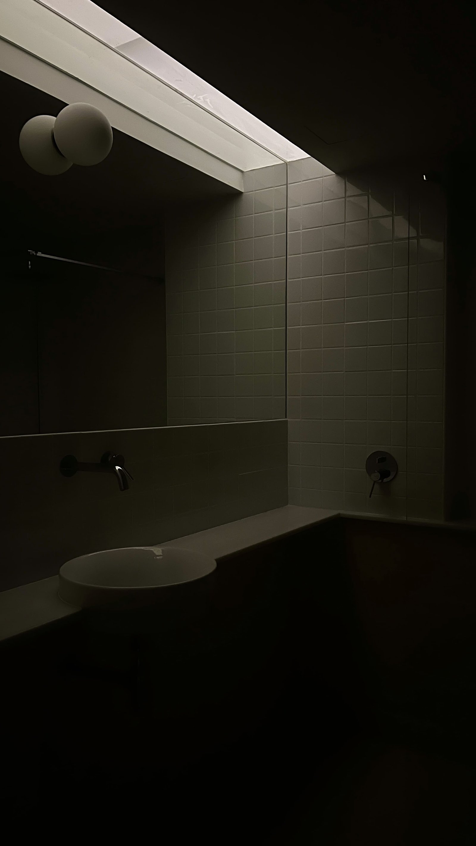 La entrada de luz natural fue uno de los principales desafíos del proyecto. La vivienda disponía únicamente de una ventana a la calle, destinada al dormitorio principal. El resto de la iluminación se logra a través del gran ventanal orientado al sur, abierto al patio ajardinado, cuya luz atraviesa los pórticos e inunda por completo el espacio.