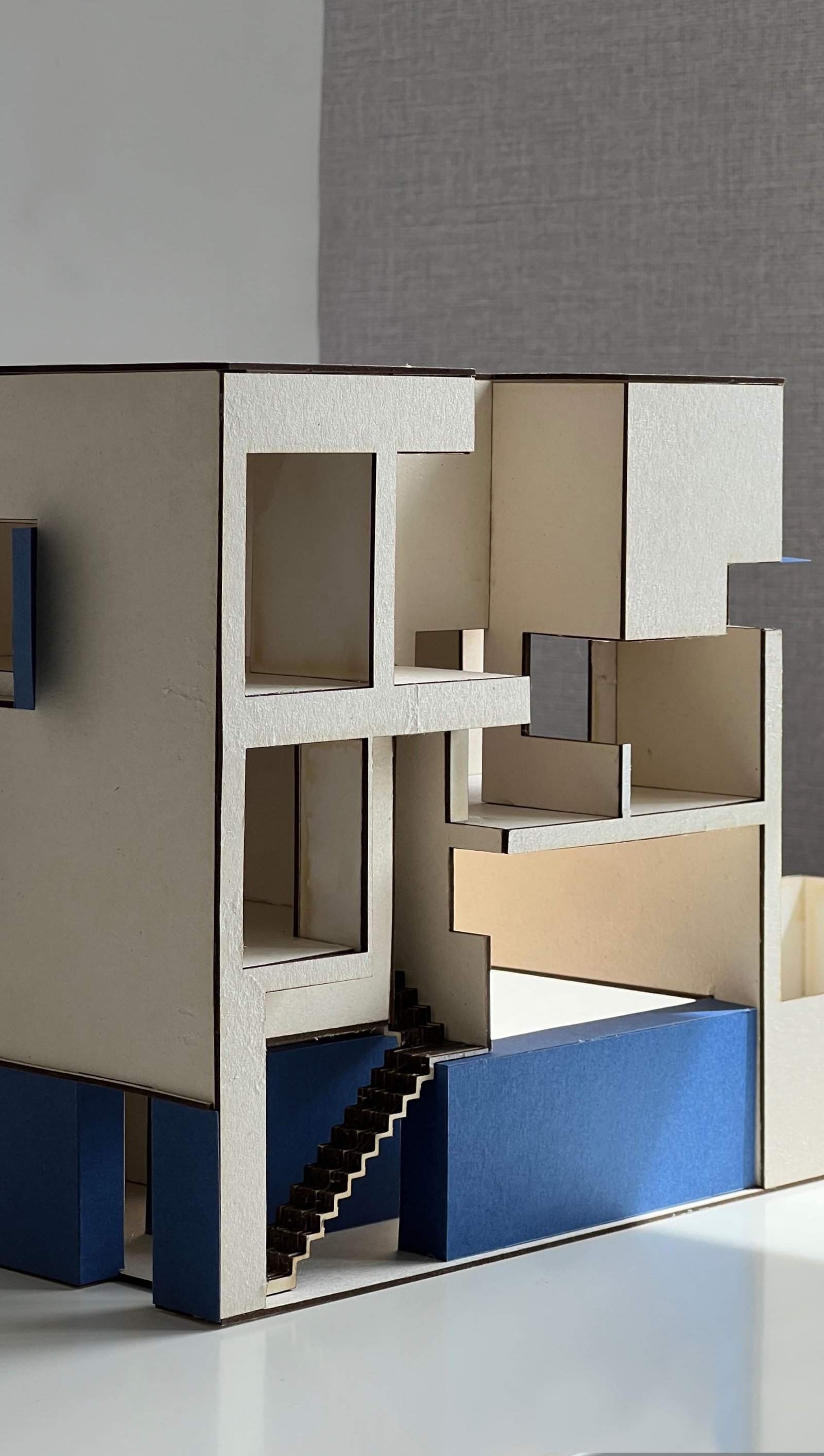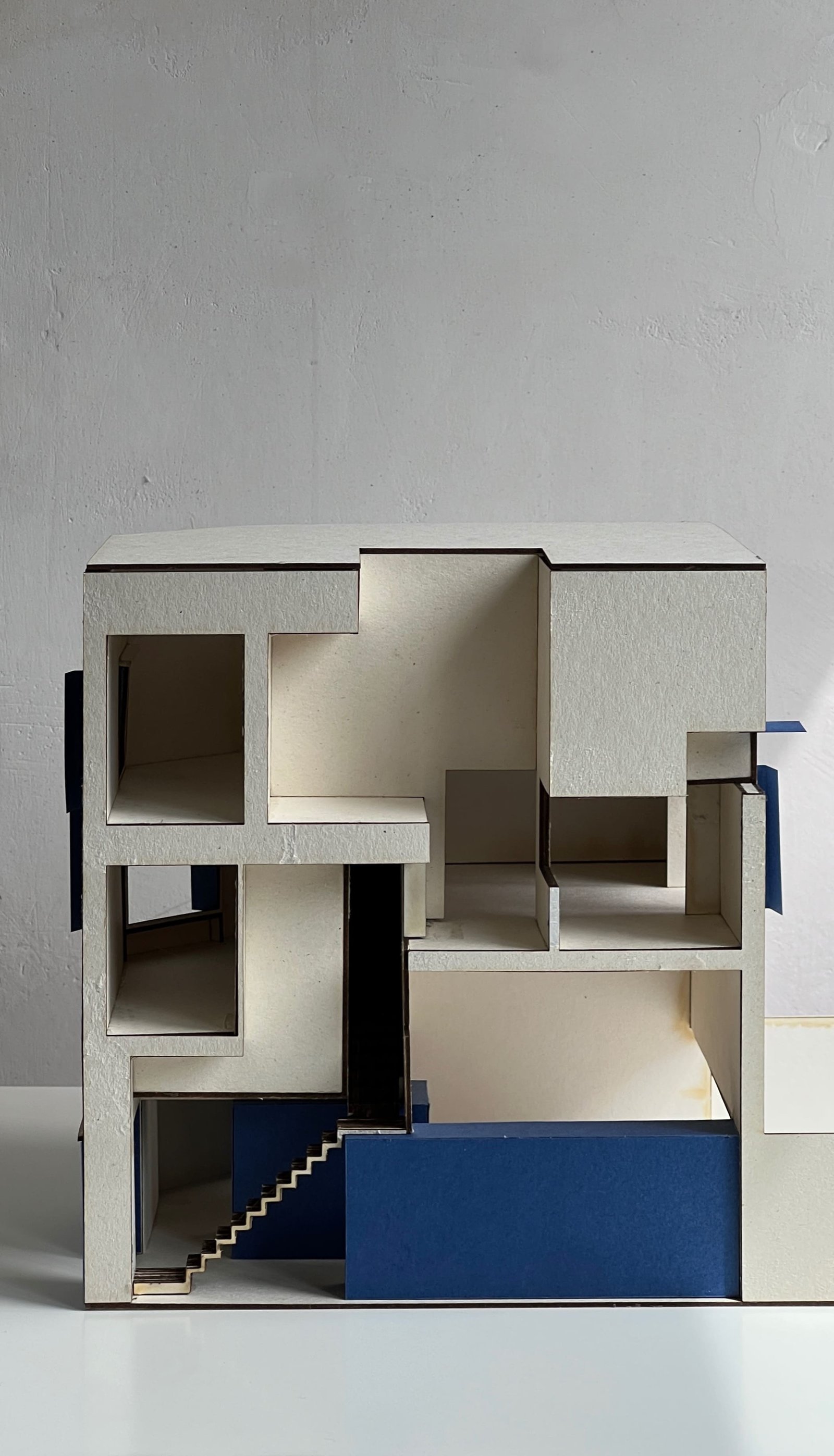 En el interior, un volumen rectangular alberga el baño de cortesía y delimita el recibidor y las circulaciones que lo rodean. La escalera se convierte en el elemento principal que ordena los espacios en sección: la columna vertebral que da acceso a las estancias de cada planta.